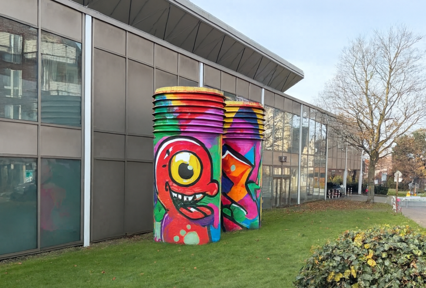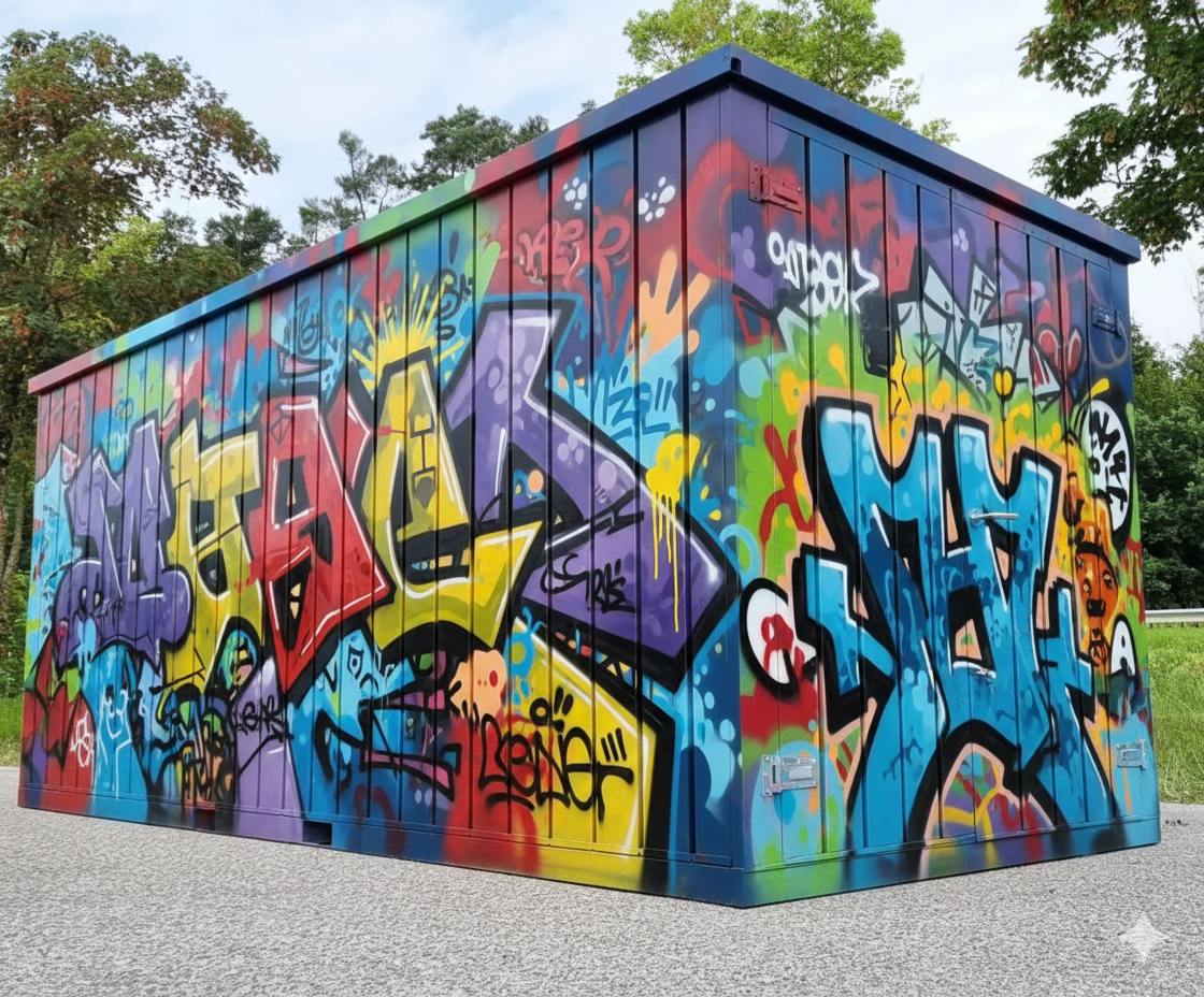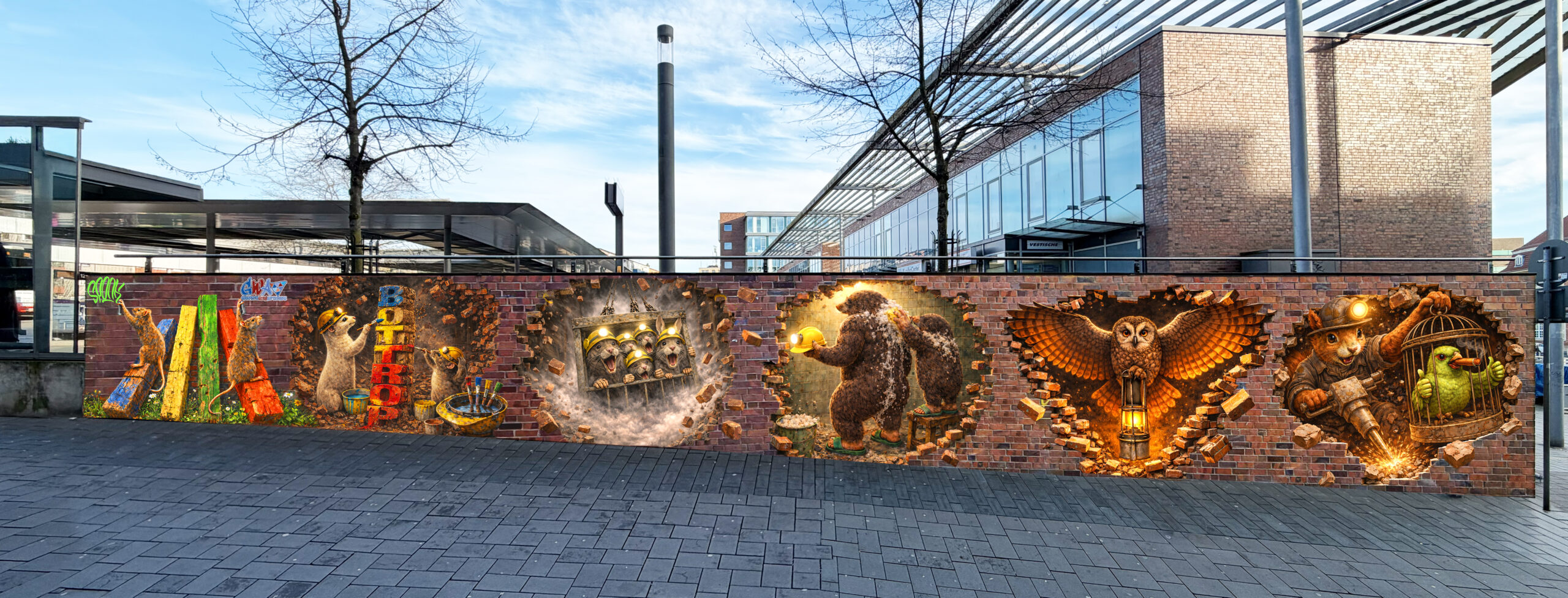 Die Mauerflächen rund um den Bottroper Saalbau befinden sich derzeit in einem uneinheitlichen und teilweise ungepflegten Zustand. Verwitterter Beton, wuchernde Vegetation und nicht-legale Graffitis prägen das Bild.